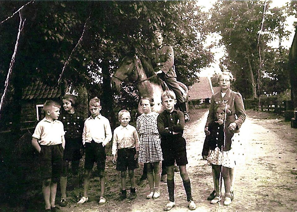 Genoeg tijd voor ontspanning, ruimte voor ontmoetingen, zoals tussen deze kinderen in Nes en de Duitse soldaat te paard, in juli 1941.