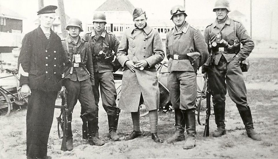 Duitse en Nederlandse militairen poseren gemoedelijk voor een foto aan het einde van de Strandweg in Nes. De strandpaviljoens Scheltema en Steinvoorte zijn nog net zichtbaar.